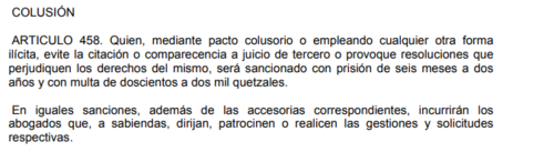 "Quien, mediante pacto colusorio o empleando cualquier otra forma ilícita, evite la citación o comparecencia a juicio de tercero o provoque resoluciones que perjudiquen los derechos del mismo, será sancionado con prisión de seis meses a dos años y con multa de doscientos a dos mil quetzales", se lee en el artículo.
