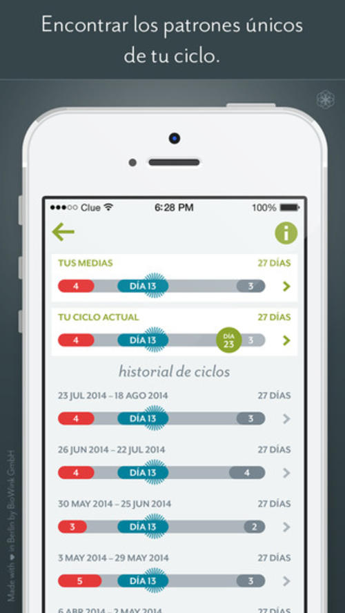 La app le pide a la usuaria algunos datos y de esa forma empieza a hacer sus cálculos. Uno de méritos de Clues, es que tiene la capacidad de aprender de cada persona que la usa y empieza hacer un seguimiento personalizado, dependiendo de la forma en que su cuerpo se comporte durante el mes.