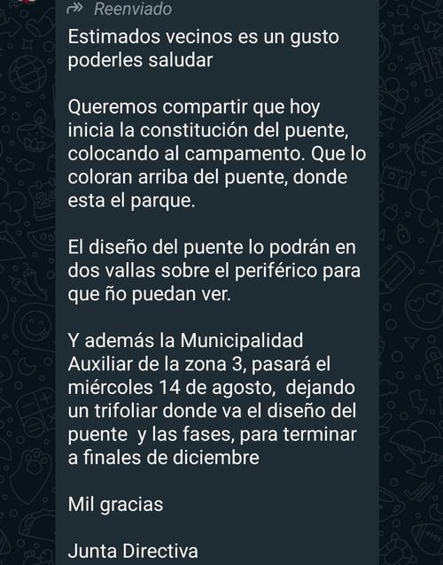 Un vecino de la colonia Bran compartió con Soy502 el mensaje de texto que la junta directiva les hizo llegar, con información respecto a los trabajos en el sector.