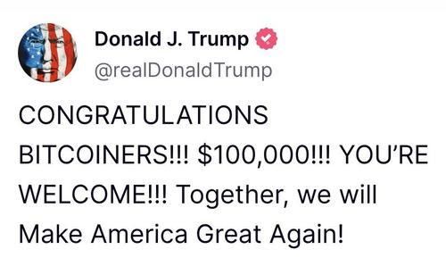 "¡¡¡FELICIDADES BITCOINERS!!! ¡¡¡$100,000!!! ¡¡¡DE NADA!!! ¡Juntos haremos América grande otra vez!", escribió en Truth Social el presidente electo, que el 20 de enero regresará a la Casa Blanca.