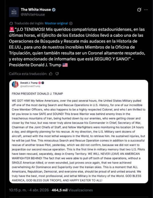 "¡LO TENEMOS! Mis compatriotas estadounidenses, en las últimas horas las Fuerzas Armadas de Estados Unidos efectuaron una de las Operaciones de Búsqueda y Rescate más audaces de la historia de nuestro país, para uno de nuestros increíbles oficiales de tripulación, quien además resulta ser un coronel muy respetado", escribió Trump en su plataforma Truth Social.