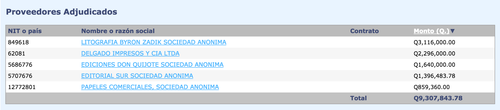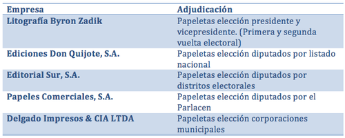 La empresa que tiene el contrato más alto es la Litografía Byron Zadik con 3 millones 116 mil. Será la empresa encargada de realizar la impresión de las papeletas electorales para la elección presidencial en la primera y segunda vuelta.