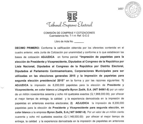 La junta de cotización del Tribunal Supremo Electoral (TSE) adjudicó la impresión de 49.2 millones de papeletas electorales, por un total de 9 millones 307 mil 843 quetzales, repartida en cinco empresas.