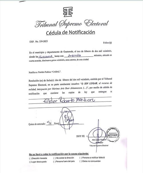 El Tribunal Supremo Electoral (TSE) emitió la cédula de notificación para resolver que deja sin lugar el recurso de nulidad interpuesto por Marinus Arie Boer Johannessen en contra del binomio presidencial del partido político Cabal.