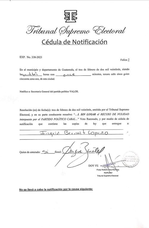 Ante ello, los partidos Cabal y Winaq presentaron recursos de nulidad para la candidatura de Ríos. Sin embargo, la medida fue anulada. El TSE emitió la resolución que da luz verde a Zury Ríos como candidata del partido Valor para participar en las Elecciones 2023. El documento fue realizado el 3 de febrero a la 23:10 horas.