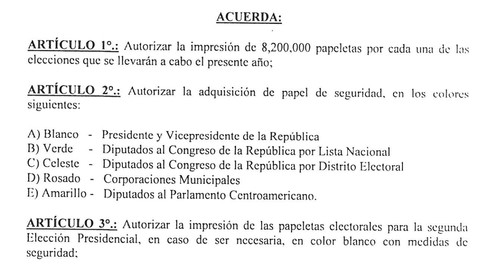 Además, se ha confirmado que los colores de las papeletas serán los mismos que los utilizados hace cuatro años: blanco, para la elección presidencial; verde, para diputados por lista nacional; celeste, para diputados distritales; rosado, para corporaciones municipales, y gris, para el Parlamento Centroamericano.