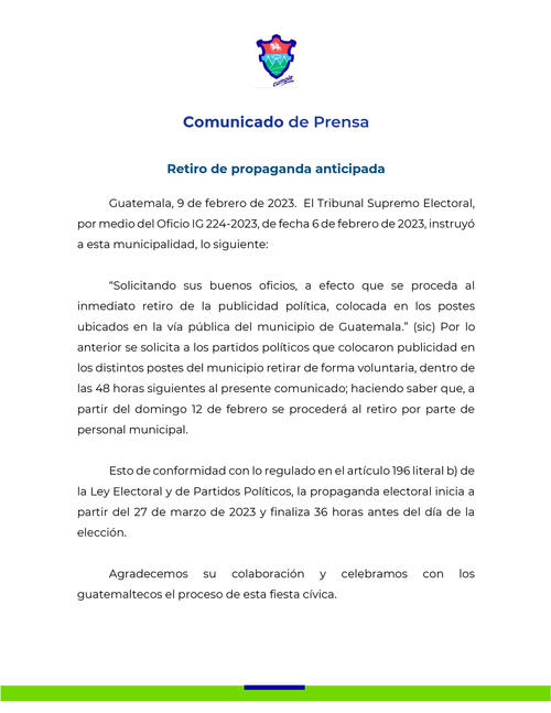 La Municipalidad de Guatemala confirmó en un comunicado que el Tribunal Supremo Electoral (TSE) les solicitó el inmediato retiro de la publicidad política colocada en postes del municipio de Guatemala.