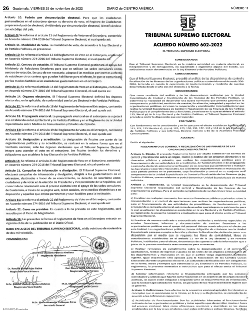 Además, el TSE publicó el Acuerdo 601-2022, con el cual realiza modificaciones al voto en el extranjero. En esta modificación, señala que el voto seguirá siendo presencial. Los guatemaltecos en el extranjero pueden inscribirse para su padrón electoral con anticipación no menor a tres meses de la elección de presidente y vicepresidente de la República. El registro puede hacerse por internet y es requisito tener DPI.