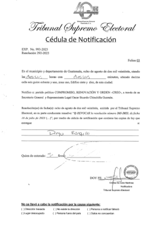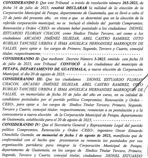 La decisión del TSE fue tomada después de que el síndico titular, primero, segundo, tercero y cuarto concejal del partido Compromiso Renovación y Orden (CREO) renunciaran a su postulación.