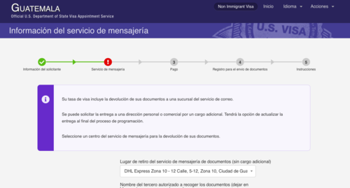 Después, seleccionar el lugar en donde deseas recibir tus documentos. Cuyo costo está incluido en el pago de la solicitud de Visa.