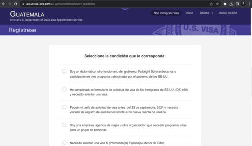 Ahí seleccionarás la opción 2: "He completado el formulario de solicitud de visa de No Inmigrante de EE.UU. (DS-160) y necesito solicitar una visa". Esto aplica solo para visa de no inmigrante.