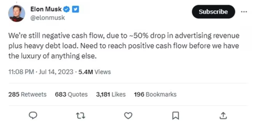 "Todavía tenemos un flujo de caja negativo, debido a una caída de -50 % en los ingresos por publicidad más una fuerte carga de deuda. Necesitamos alcanzar un flujo de caja positivo antes de que podamos permitirnos el lujo de cualquier otra cosa", describe el tuit realizado por Musk.