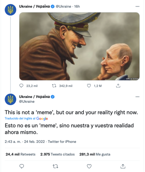Horas después que Rusia comenzara con las operaciones militares en el territorio de Ucrania, la cuenta de Twitter oficial del Gobierno ucraniano publicó una caricatura en la que se puede ver a Adolf Hitler sonriéndole a un Vladimir Putin más pequeño, como si de padre e hijo se tratara.