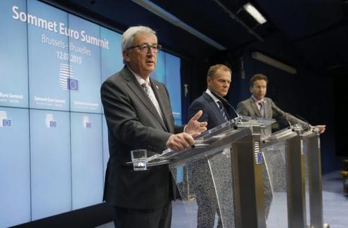 El presidente de la Comisión Europea, Jean-Claude Juncker (izquierda), el presidente del Consejo Europeo, Donald Tusk, y el presidente del Eurogrupo, Jeroen Dijsselbloem, durante la confeencia. (Foto: EFE)