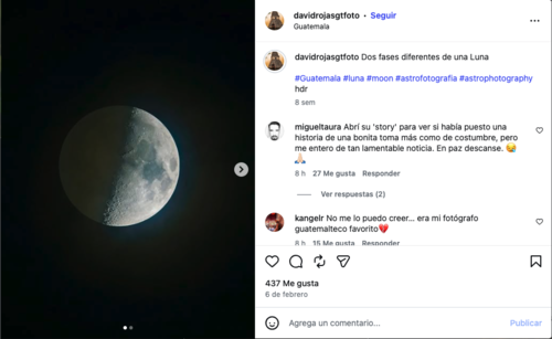 La noche del lunes 6 de abril, a través de su cuenta oficial en Instagram, se dio a conocer la muerte del guatemalteco David Rojas.