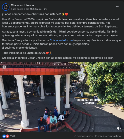 "Hoy, 8 de enero del 2025, cumplimos 5 años de llevarles nuestras diferentes coberturas a nivel local y departamental. Quiero expresar mi gratitud por estar siempre con nosotros, nos honramos poderles informar sobre los acontecimientos del departamento de Suchitepéquez. Todo inició un 8 de enero de 2020", destaca la publicación.