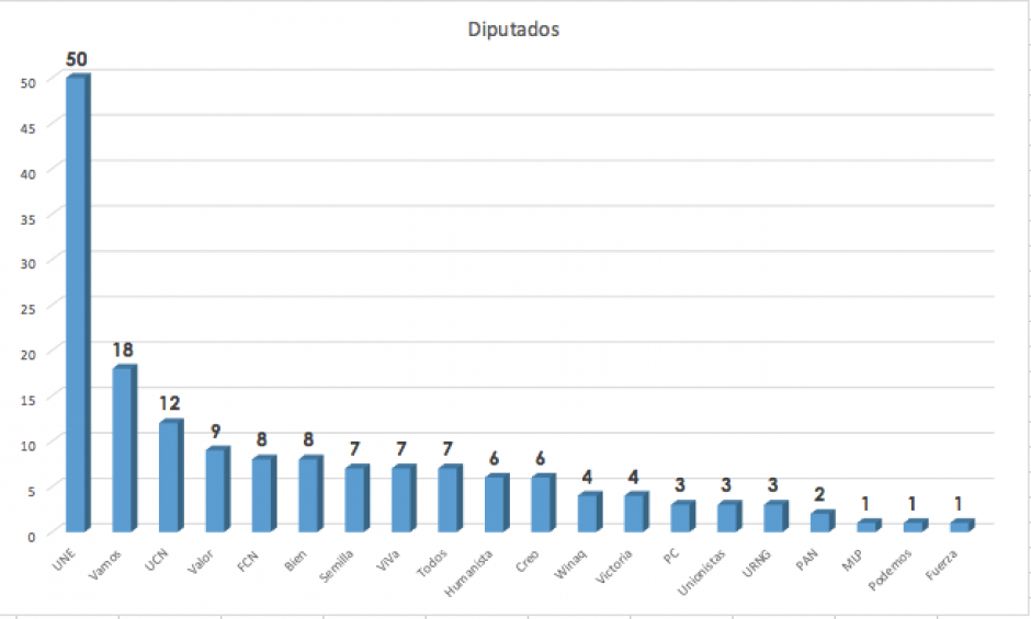 La Unidad Nacional de la Esperanza (UNE) tendría la bancada más numerosa en el Organismo Legislativo con 50 diputados, seguido del partido Vamos con 18 y la UCN con 12.