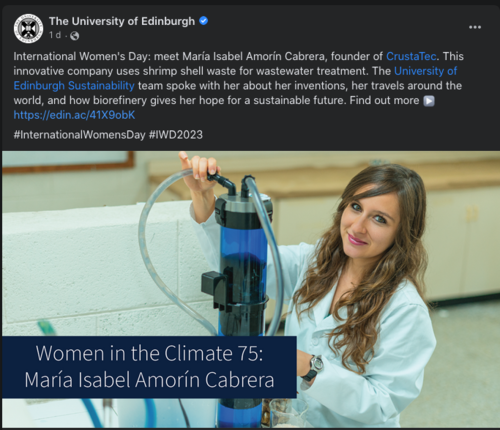 "Conoce a María Isabel Amorín Cabrera, fundadora de CrustaTec. Esta empresa innovadora utiliza desechos de caparazón de camarón para el tratamiento de aguas residuales. El equipo de Sostenibilidad de la Universidad de Edimburgh habló con ella sobre sus inventos, sus viajes por el mundo y cómo la biorrefinería le da la esperanza de un futuro sostenible", resaltó la publicación.