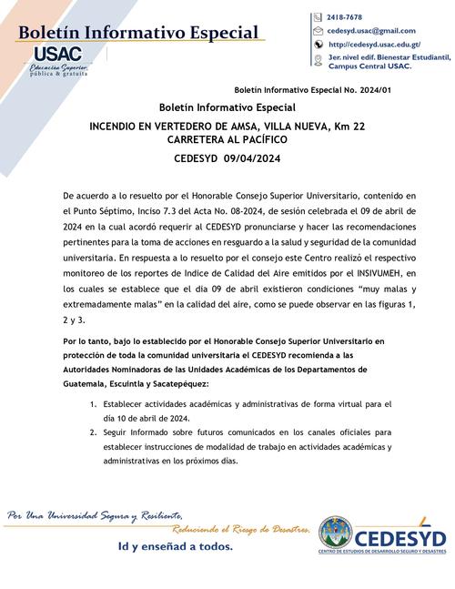 Según explicaron esta medida fue tomada tras lo resuelto por el Consejo Superior Universitario (CSU) y con el monitoreo de los reportes del Índice de Calidad del Aire (ICA), emitidos por el Instituto Nacional de Sismología, Vulcanología, Meteorología e Hidrología (Insivumeh).