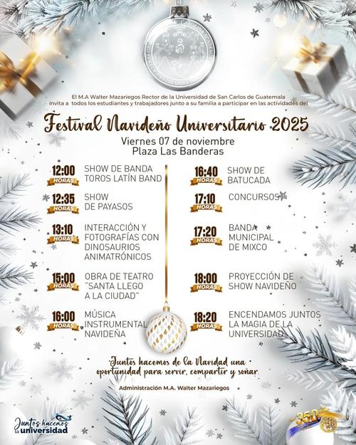 La Universidad de San Carlos de Guatemala ha convocado oficialmente a estudiantes, familiares y colaboradores a participar en el Festival Navideño Universitario 2025, el cual se llevará a cabo en la Plaza Las Banderas.