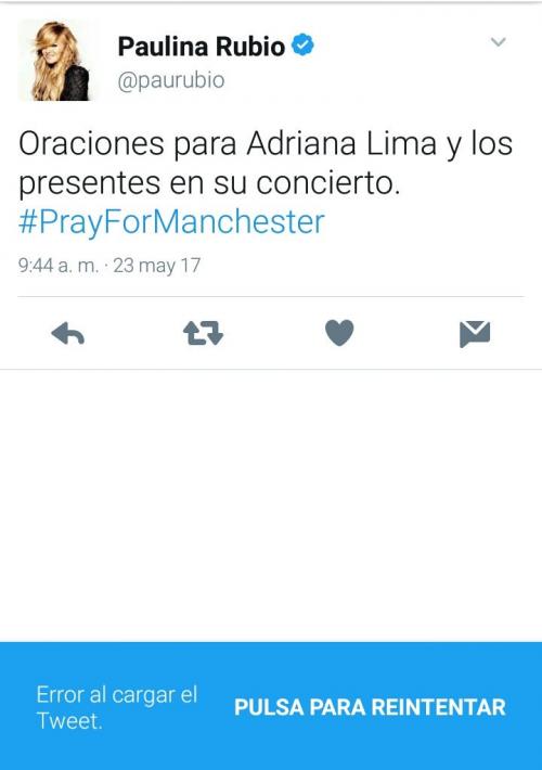 La mexicana Paulina Rubio no se quiso quedar atrás, pero cometió un gran error. La Chica Dorada escribió en su cuenta de Twitter el siguiente mensaje: "Oraciones para Adriana Lima y los presentes en su concierto #PrayForManchester".