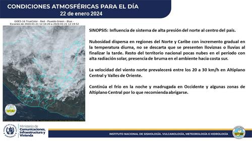 Para este lunes 22 de enero el Instituto Nacional de Sismología, Vulcanología, Meteorología e Hidrología (Insivumeh) informó que habrá nubosidad dispersa en las regiones del Norte y Caribe con incremento gradual en la temperatura diurna, no se descarta la posibilidad de lluvias o lloviznas al final de la tarde.