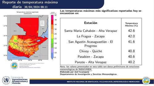 De acuerdo con el Instituto Nacional de Sismología, Vulcanología, Meteorología e Hidrología (Insivumeh) algunos sectores de Guatemala han reportado temperaturas superiores a los 42 ºC.