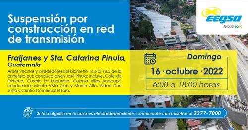 - Fraijanes y Santa Catarina Pinula: km 16.5 a 18.5 de la carretera que conduce a San José Pinula que incluye: Calle de Olmeca, Caserío La Laguneta, Colonia Villas de Anacapri, Condominios Montevista Club y Monte alto, Aldea Don Justo y Centro Comercial El Faro. En horario de 6:00 a 18:00 horas.