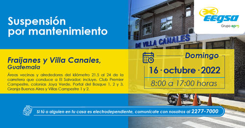 - Fraijanes y Villa Canales: km 21.5 a 24 de Carretera a El Salvador que incluye: Club Premier Campestre, Colonias Joya Verde, Portal del Bosque 1,2 y 3, Granja Buenos Aires y Villas Campestre 1 y 2. En horario de 8:00 a 17:00 horas.
