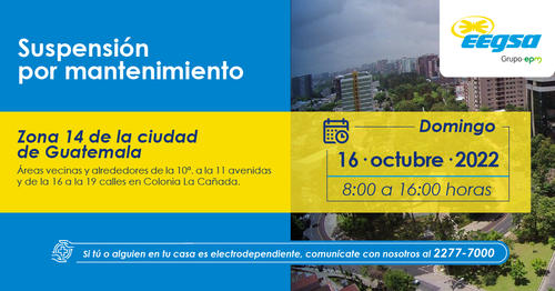 Este domingo 16 de octubre varios capitalinos no podrán acceder al servicio de electricidad ya que EEGSA ha anunciado la suspensión de la energía.
