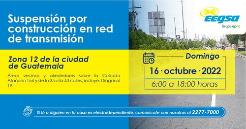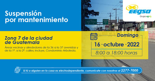 Los sectores que serán afectados incluyen zonas 7, 12, 14 de la ciudad de Guatemala, Fraijanes, Sta. Catalina Pinula y Villa Canales. La razón, es por trabajos de mantenimiento en la red.