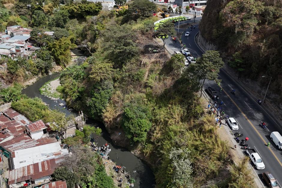 Un autobús de los Transportes Tineca colisionó con dos vehículos y cayó a lo profundo de un barranco que se ubica en la calzada La Paz, a un costado del cementerio Las Bouganvilias.