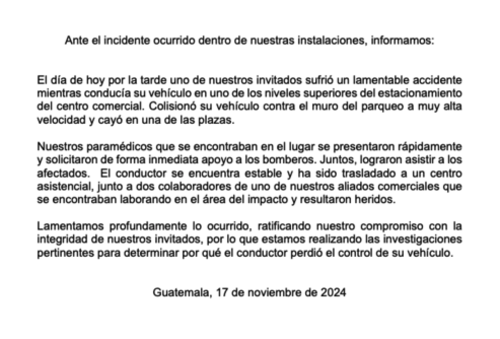"El día de hoy por la tarde uno de nuestros invitados sufrió un lamentable accidente mientras conducía su vehículo en uno de los niveles superiores del estacionamiento del centro comercial. Colisionó su vehículo contra el muro del parqueo a muy alta velocidad y cayó en una de las plazas", se lee en la primera parte.