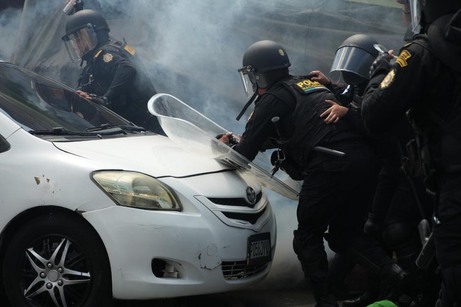Mientras se registraban estos incidentes, el conductor de un vehículo, que presuntamente es utilizado como taxi no autorizado, aprovechó para embestir a varios antimotines, que buscaban liberar el área.