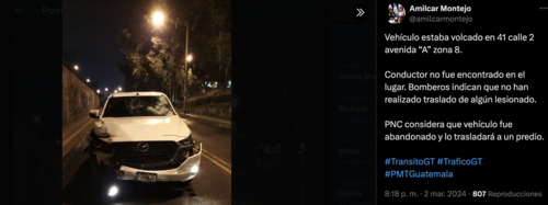 Un desconcertante escenario para las autoridades se registró la noche del sábado 2 de marzo en la 41 calle, 2 avenida "A" de la zona 8, donde un vehículo fue descubierto tras haber volcado.