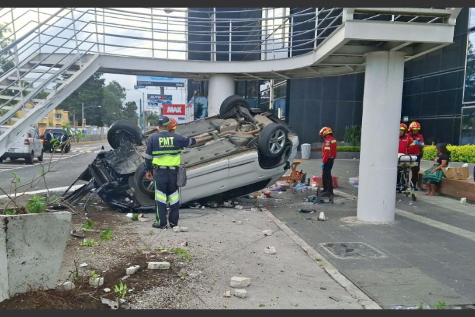 Un auto volcó y cayó sobre una venta de comida en zona 10.