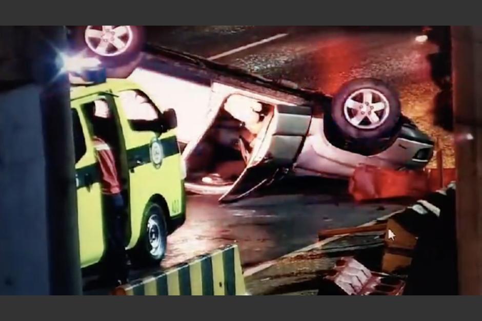 Un vehículo terminó volcado en plena calzada Roosevelt, la noche de este martes 3 de octubre. Tras las lluvias, otros accidentes también ocurrieron en la ciudad de Guatemala.