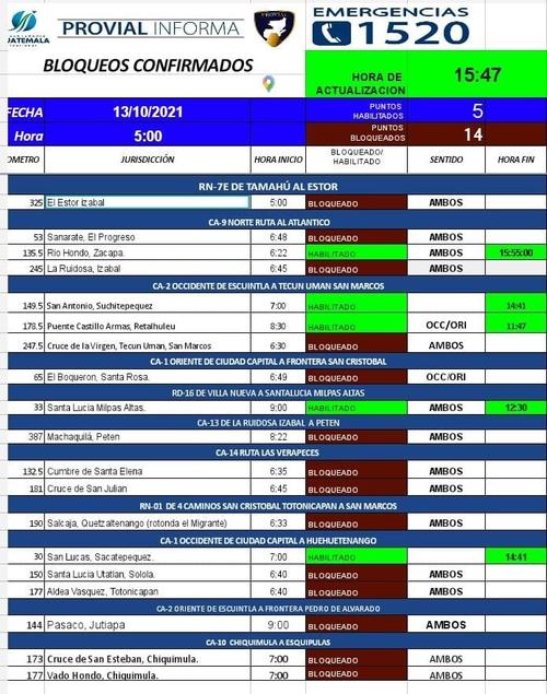 De acuerdo con Provial, 15 puntos permanecen bloqueados y cinco ya fueron liberados, estos son: San Lucas Sacatepéquez, San Antonio Suchitepéquez, Río Hondo, Puente Castillo Armas y Santa Lucía Milpas Altas.