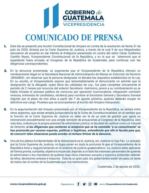 De acuerdo con un comunicado de la Vicepresidencia, el amparo fue presentado ante la Corte de Constitucionalidad (CC), en donde se establece que la CSJ no debe de ser un ente de gestión, sino que ostenta su propia potestad de administrar la justicia.