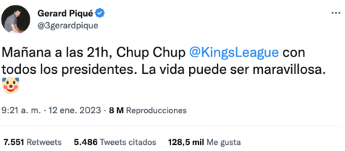 "Mañana a las 21h, Chup Chup Kings League con todos los presidentes. La vida puede ser maravillosa", escribió Piqué seguido del emoji de un payaso.