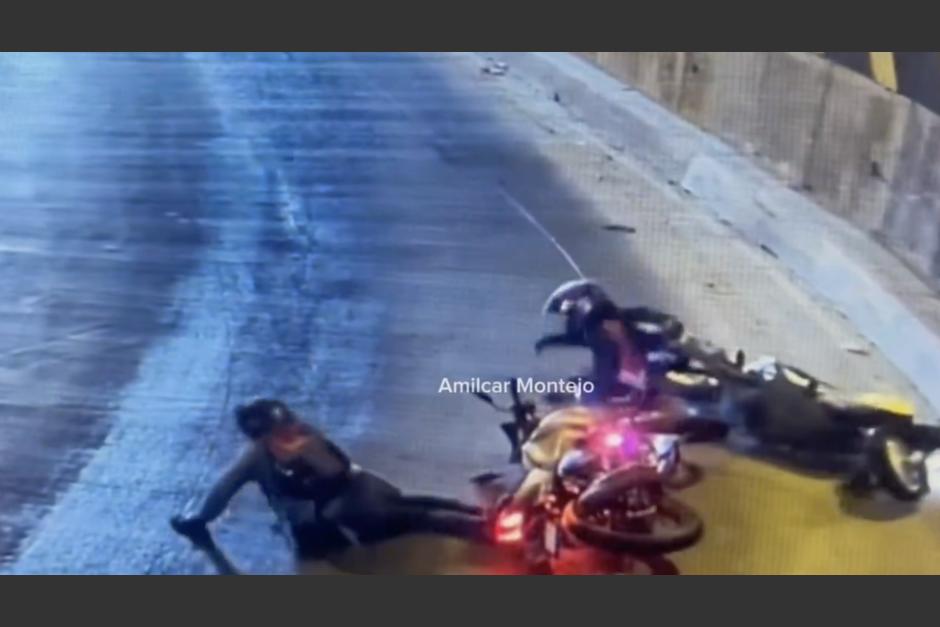 Las imágenes muestran el instante en que las dos motocicletas se resbalan y provocan el accidente en un viaducto de la 35 calle de la zona 12 de la ciudad de Guatemala, bajo la avenida Petapa.