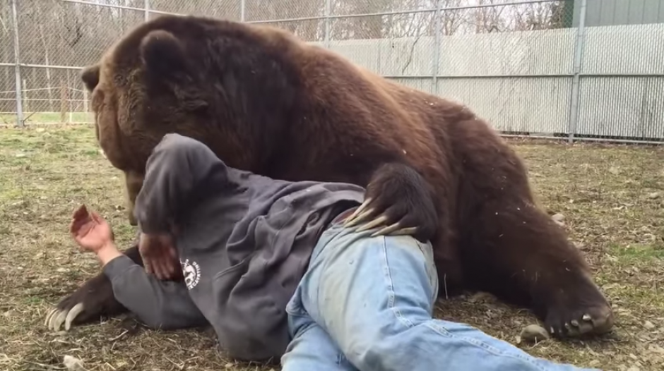 Se puede observar la buena relación que existe entre ambos, no obstante, su tiempo de calidad juntos no está exento de momentos de tensión. En un reciente video, donde se observa a Kowalczik y a Jimbo pasando un rato en el jardín donde suelen hacerlo, hay un momento en el cual el gran oso intenta morder la cabeza de su cuidador. Por fortuna no pasó a mayores.