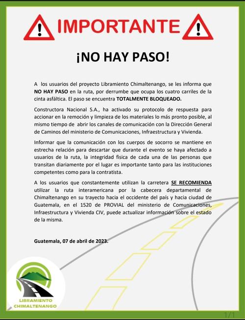 El deslizamiento de tierra ocurrió durante la noche de este Jueves Santo 6 de abril en el kilómetro 61 de dicha ruta. En el comunicado, la constructora confirma que se deben realizar las labores de descombro y por lo tanto pide a los usuarios utilizar la ruta Interamericana que cruza por el casco urbano de Chimaltenango.