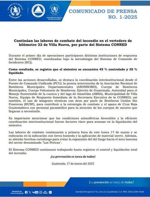 Por su parte, la Coordinadora Nacional para la Reducción de Desastres (Conred) informó que las labores de combate del incendio continúan. Según su comunicado, el siniestro se encuentra un 45% controlado y un 35% liquidado.