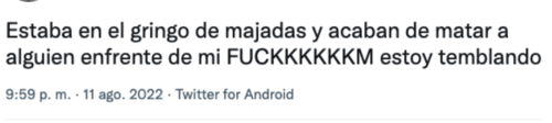 "Hoy salimos tipo tranqui con mis amigos al gringo de majadas y la cosa paró en balacera. Literal para salir de ahí pasamos casi encima del chavo al que mataron", escribió una usuaria de Twitter.