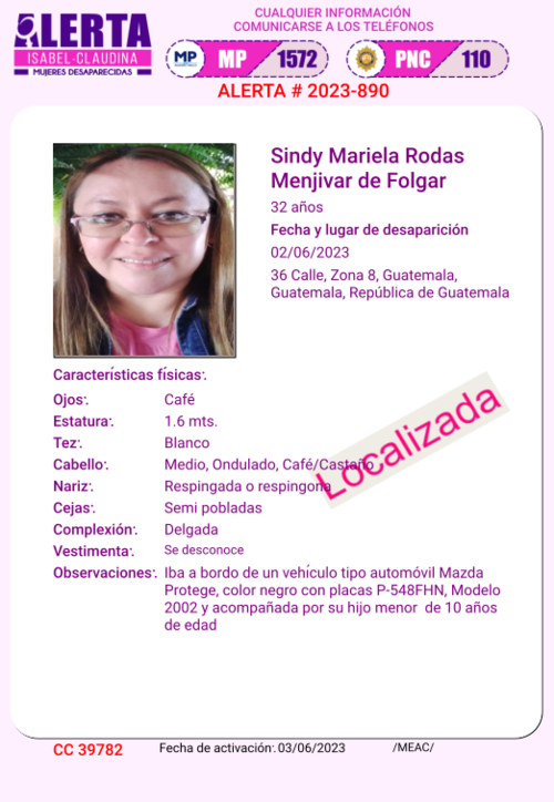 Un desenlace similar tuvo el caso de Sindy Mariela Rodas Menjivar, cuya desaparición junto con su hijo de 10 años, se reportó el pasado 2 de junio, cuando se movilizaba en su automóvil.