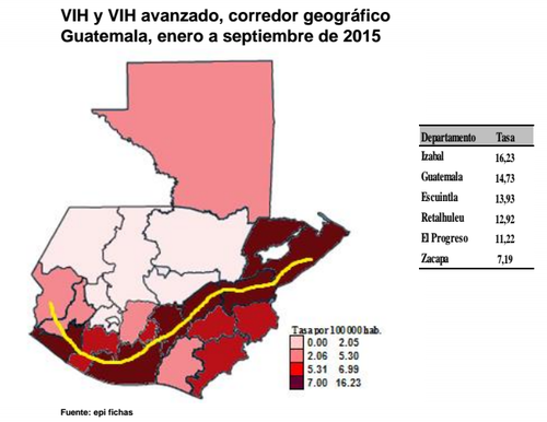 En total se estima que 2 millones de latinoamericanos viven con VIH. En Guatemala, el corredor geográfico, según los mayores índices de tasa en este año, va desde Retualhuleu hasta Izabal.