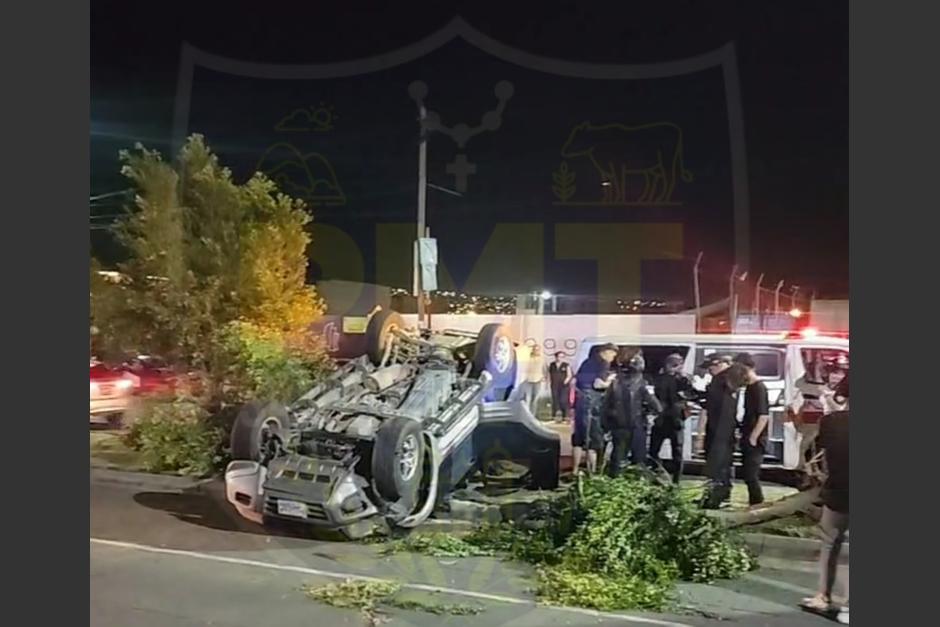 Tras el hecho de tránsito, un vehículo terminó volcado en el arriate central, según dan cuenta imágenes compartidas por la Policía Municipal de Tránsito (PMT) de San Miguel Petapa.