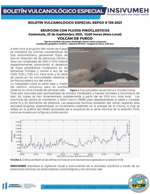 El Insivumeh puntualiza que se han detectado dos flujos de lava de 1,200 y 1,000 metros hacia las barrancas Ceniza y Seca. Además, señalan que hay descenso de flujos piroclásticos moderados y caída de ceniza. También describe la percepción de sonidos de locomotora de tren, retumbos moderados.
