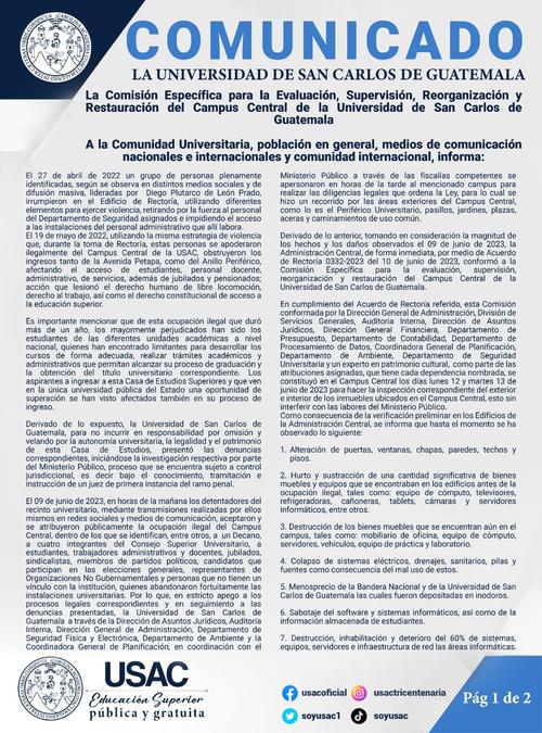 Además, resaltaron: "Pero más allá de los daños materiales, han dañado la historia, el patrimonio y retrasado el curso de la educación superior pública del país que por más de 347 años ha impartido la Universidad de San Carlos de Guatemala".